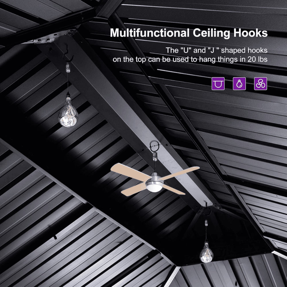 Upgrade your outdoor living space with the PURPLE LEAF 12′ x 20′ Hardtop Gazebo, designed for superior durability, timeless elegance, and year-round use. Featuring a teak-finish aluminum frame, a rust-resistant galvanized steel roof, and upgraded netting, this gazebo is built to provide a stylish, functional, and weather-resistant retreat for your backyard, patio, or garden.