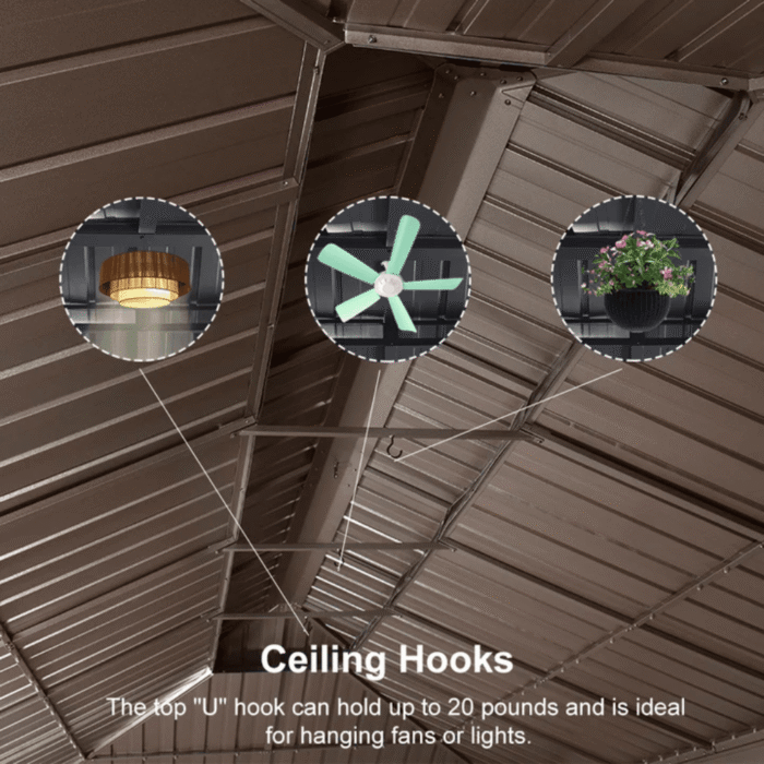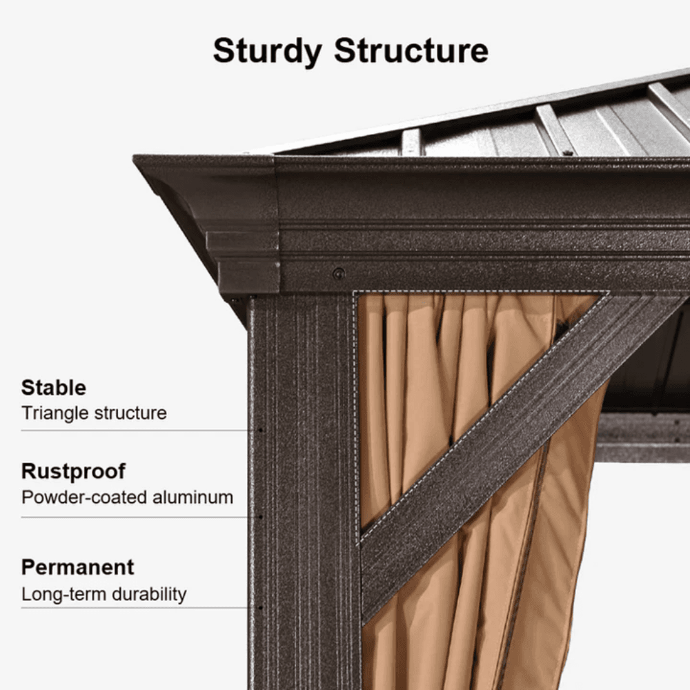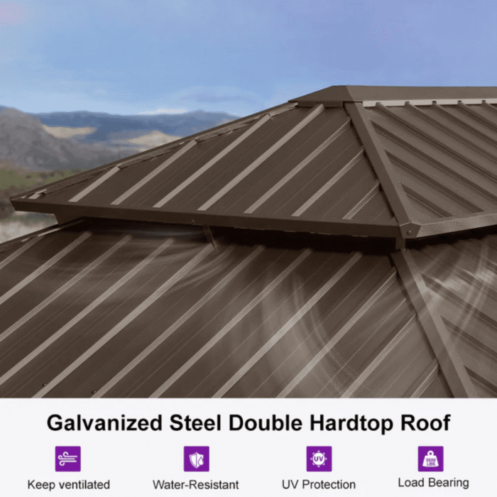 • Material: Aluminum frame with galvanized steel hardtop roof